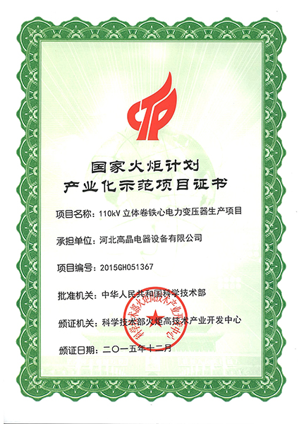 國家火炬計(jì)劃產(chǎn)業(yè)化項(xiàng)目證書