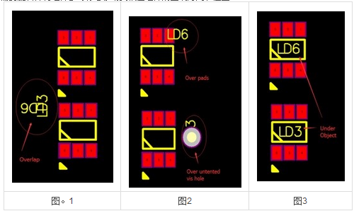 檢查放置在與焊盤重疊的電路焊盤上的元件參考指示器標記,如圖2中圈出的第一個組件標記。 由于它們通常被裁剪掉而沒有被打印,并且在PCB組裝和故障排除期間需要將組件參考標記作為參考,所以您需要將這些標記移動到位于相應組件旁邊的開放空間。