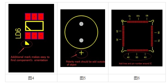 在絲網上的微芯片(IC)上添加針腳和線數的測量標記,如圖6所示。在組件對象標記的外面放置圖5中正極標記的極性標記。 對于像大容量電容器或其他具有特定極性的元件這樣的元件,可以減少電路板裝配過程中元件方向錯誤的可能性,從而使工藝更平滑。