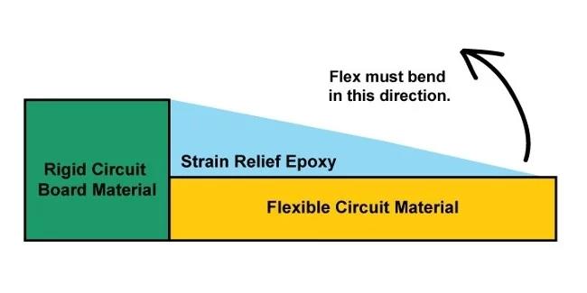 如果部件在界面處彎曲,剩余的固化樹脂可能會損壞下面的柔性層壓板。 為了保護(hù)下面的柔性層壓板, 柔性PCB設(shè)計師需要在彎曲過渡區(qū)域中的應(yīng)力消除環(huán)氧樹脂。 如下圖所示,施加的固化環(huán)氧樹脂將有助于延長經(jīng)過剩余固化樹脂的彎曲區(qū)域。