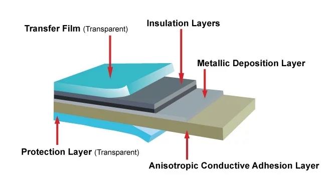 隔離層的顏色為黑色,并且具有抗摩擦性能。 薄膜在熱和壓力下層壓。 導(dǎo)電粘合劑流入覆蓋層開口,然后粘合并電連接到地面。
